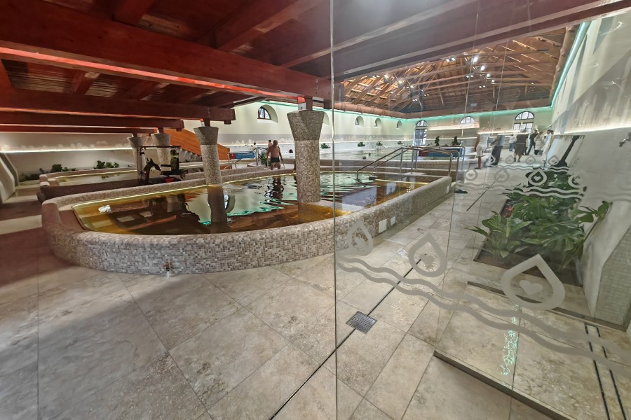 A kinti részen egy 31-34°C-os gyógyvizes dögönyözős medence is található.