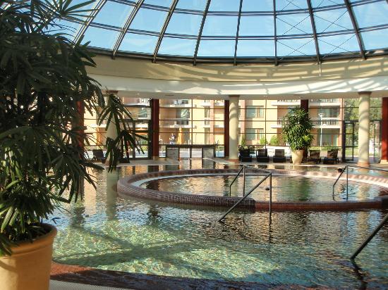 Az esti fények különben is kellemessé teszik itt a fürdőzést: a meghittebb hangulatban jótékony félhomály fedi a keletinek kevéssé mondható stíluselemeket is. Ilyen például a központi, relaxációs medencét körülvevő beton oszlopsor (talán színesre kéne festeni?), és a felette lévő fém-üveg kupola. Kicsit sok itt a fém és az üveg ahhoz, hogy igazán keleties legyen a hangulat. A kellő vízmélységű (130 cm) 34 C°-os, kiúszós körmedence közepén egy 4 fokkal melegebb medencébe is található, sajnos egyik sem termálvizet tartalmaz. Bár hazánkban - ahol kis vidéki strandokon is találkozhatunk gyógyvízzel - ez kissé fura: a fürdőkomplexumban nincs termálkút. Valóban furcsa, hogy egy ilyen léptékű wellnessberuházásnak erre nem volt szüksége. Érdemes lett volna a beruházás egy részét arra költeni, hogy fúrnak egy saját termálkutat.