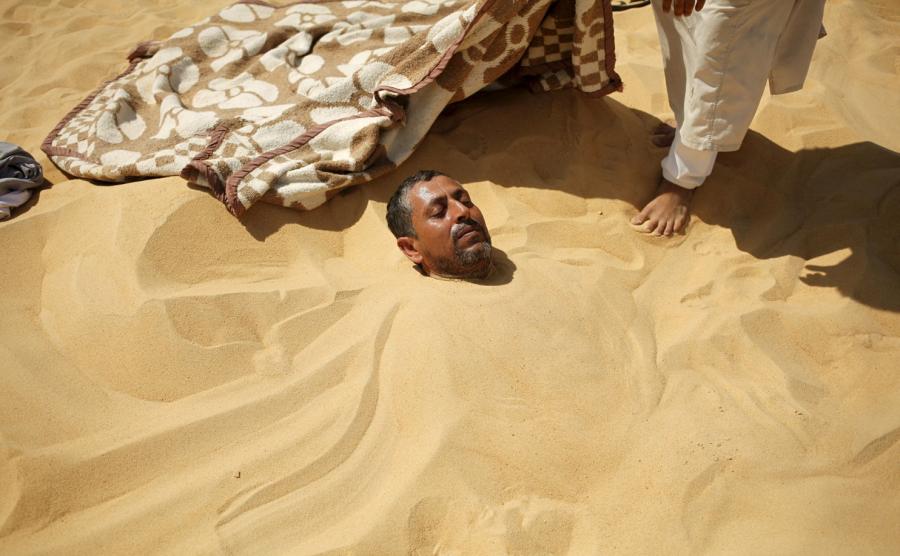 Az első terápiás, forró homokos „temetésről” szóló feljegyzés még az ókori Egyiptomból, Szívából származik. A marokkói sivatagban pedig jelenleg a berberek csinálnak jó üzletet abból, hogy „eltemetik” a turistákat. Ezen a szinten a homokterápia ugyanúgy történik most is, mint néhány ezer évvel ezelőtt. Ásnak egy sekély gödröt reggel, hogy a homok kellően felmelegedjen. A vásárló arccal felfelé nézve belefekszik a lukba, majd a fejét kivéve az egész testét betemetik nehéz homokkal. A kezelés során a berber védi a „fürdőzőt” a tűző naptól, illetve gondoskodik róla, hogy legyen mit innia. Húsz perc múlva kiássák a delikvenst, aki – ideális esetben – energiával telinek érzi magát.