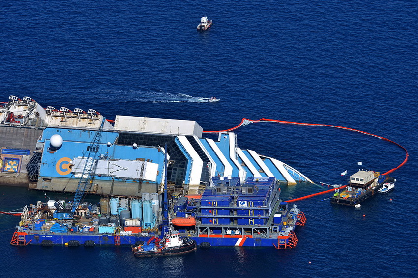 A közeli hajók dudálása és taps köszöntötte Giglio szigetén a Costa Concordia egyenesbe állítását, amelyet műszaki szakemberek, a sziget lakosai és újságírók is a helyszínen követtek figyelemmel. Jelenleg mindazonáltal a Costa Concordia szellemhajó benyomását kelti, a tengerben fekvő oldala sötét elszíneződése miatt.