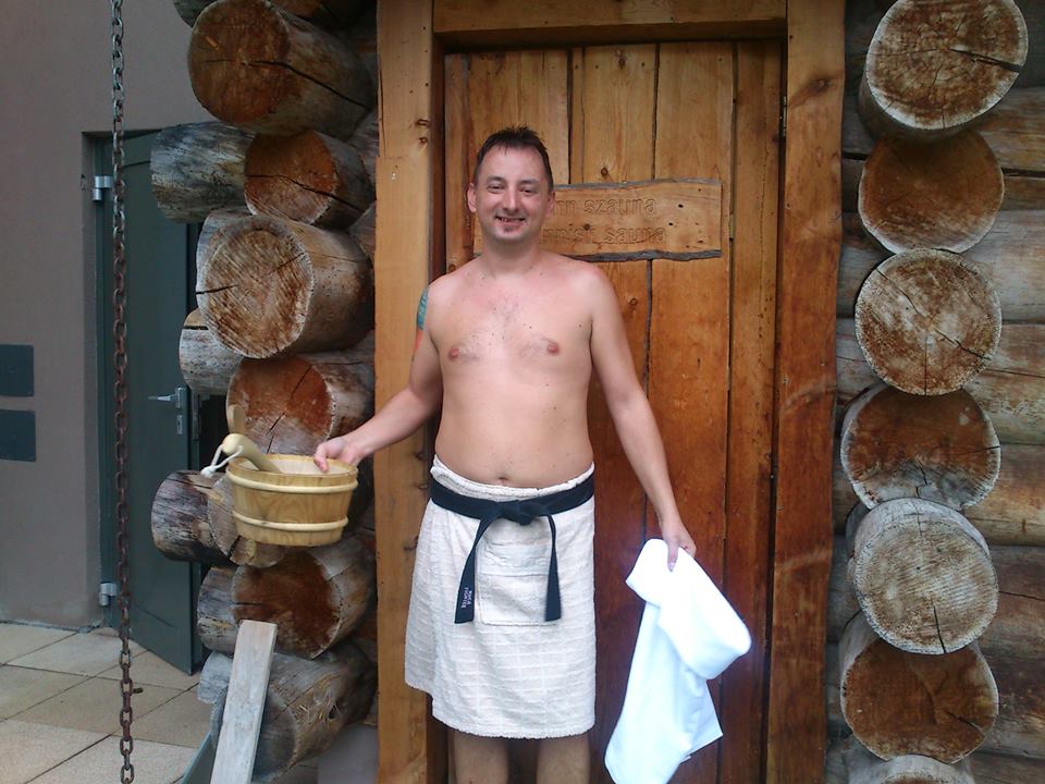 Attila nem a trükközés híve, hagyományos stílusával inkább a közvetlen, és mindent elsöprő hatásra törekszik. Ennek lényege, hogy igyekszik vendégeit egyetlen ceremónia alatt is minél többször eljuttatni a csúcsra. Végéig szépen, fokozatosan növelte a páratartalommal a forróságot, és célorientált, hathatós legyezésével, nálam többször is elérte célját. Köszönöm így utólag is! Noha a történethez hozzátartozik, hogy a tamási fürdő kétsoros, nagy szaunájába vagy húszan zsúfolódtunk be a programra. Hogy osztályrészül mi jutott? Az alsó sorban ülőknek: kevés - a felső sorban ülőknek: szenvedés. Ám, amint fentről potyogni kezdtek az emberek, Teo ügyesen felmászott a pokolba. Így a program utolsó 1-2 percében már nem fázott a nagylábujja sem, pedig addig sem a "hideg" padlón nyugtatta, hanem maga alá húzta, AHOGY KELL. Sajnos a jó példát más nem követte, illetve helyszűke miatt nem követhette.