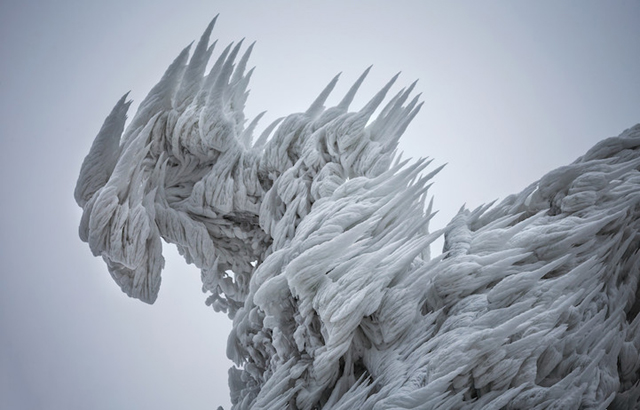 A szlovéniai Jávornik-hegység egyik síparadicsomában készített lélegzetelállító képeket Marko Korosec fotóművész. A szoborszerű képződmények a tíz napon át tartó extrém időjárás következtében alakultak ki, a szél formálta ilyenre a mindent elborító zúzmarát.