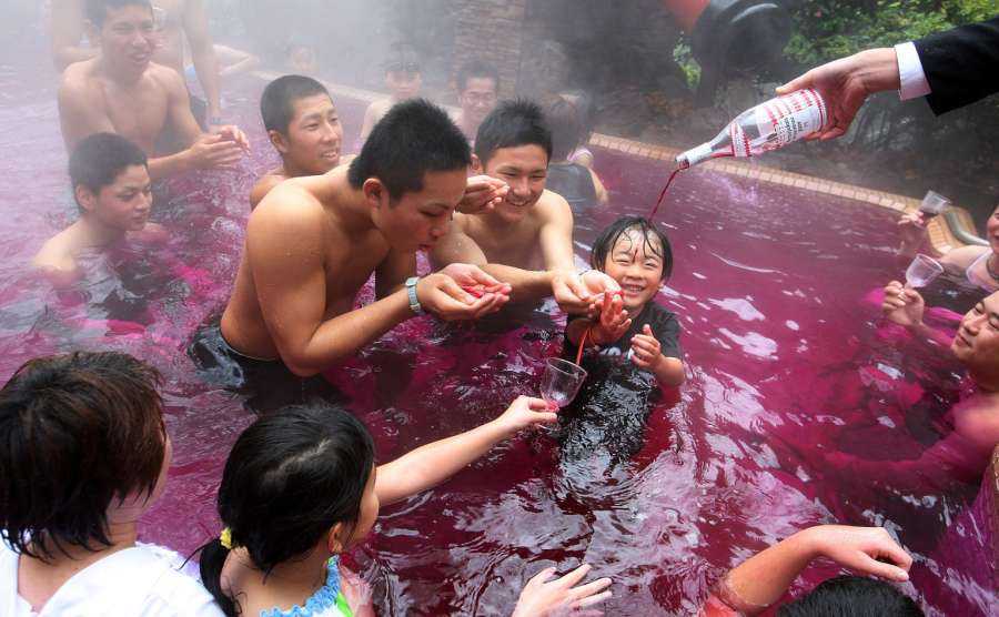 Másik „csodafürdőnk” is a felkelő nap országához kötődik. Ez a borfürdő, melynek során a szőlő és a bor antioxidáns hatását használják ki, aminek köszönhetően bőrünk új életre kel, megfiatalodik. A borfürdőt eredetileg Franciaországban a brodeaux-i borvidéken „találták fel”. Ma azonban a legnagyobb érdeklődést a japánok mutatnak a vörösboros fürdő iránt. Ráadásul itt nem csak kis mennyiségben, egyszemélyes kádakban, kezelésként alkalmazzák a nedűt, hanem afféle buliként fogják fel. A világ talán legnagyobb borfürdője Tokiótól 80 kilométerre, Hakone-ban található. Az ott működő Juneszun fürdőkomplexum többek között vörösboros medencéjéről híres, a medence mellett egy 3,6 méteres borosüveg van, és naponta friss bort öntenek bele. A fürdőzők akár bele is kortyolhatnak. Ugyanebben a fürdőben egyébként másfajta különleges medence is várja a látogatókat, van például olyan medence, amelyik szakéval van feltöltve, amely állítólag eltünteti a szeplőket és a bőrhibákat. De létezik zöld tea fürdő is, amely jó a bőrnek és javítja az immunrendszert.