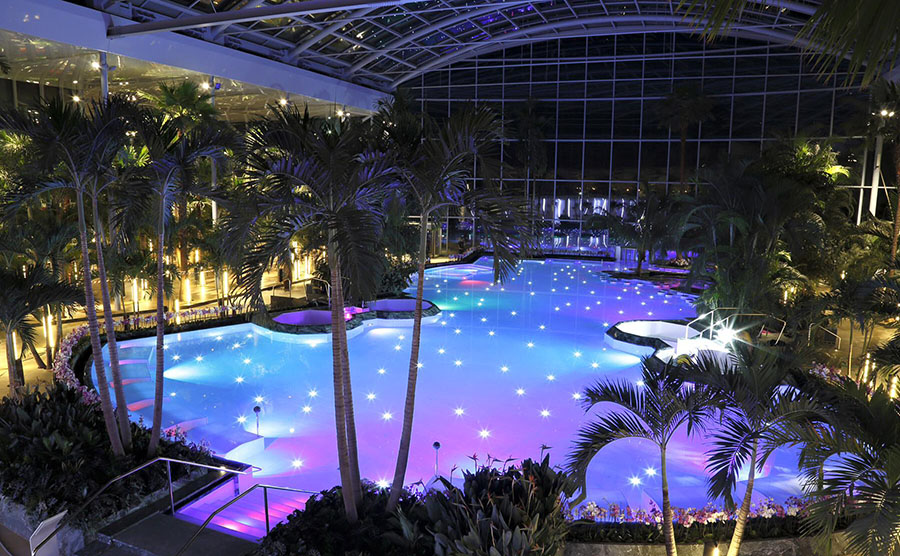 A fürdőközpontban három nagy szektort találunk. A fő terület a Palm, avagy pálma, amely mint a neve is mutatja, egy pihenésre, relaxálásra szánt terület, ahol közel 500 pálma és rengeteg növény között meditálhatunk és élvezhetjük a termálvíz gyógyító erejét. Az itt található, közel 1300 négyzetméteres medencében télen-nyáron 33 fokos a víz hőmérséklete. A Palm része egy többszörös összetételű hidromasszás fürdő, hat jacuzzi és háromféle aromaterápiás medence is. A medencéket több száz virágzó orhidea veszi körül, de találunk itt gőzfürdőt, éttermet és pihenőszékeket is.