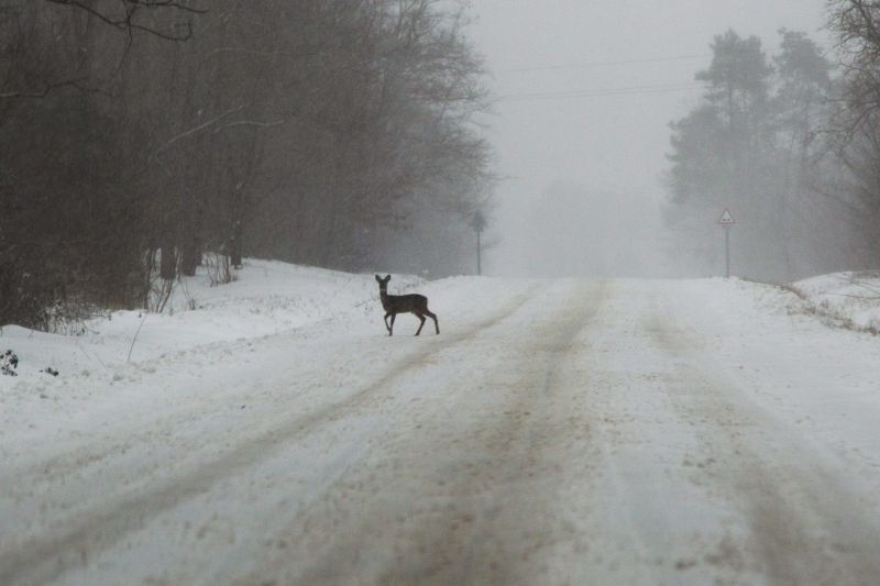Őz sétál a ködös úton a Somogy megyei Vízvár közelében