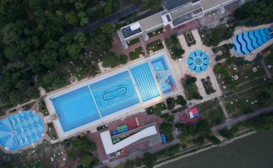 Felülnézetből a Széchenyi formás medencéi, a szecessziós Gellért hullamedencéje, a Rudas tetőmedencéje, de a Király fürdő kupolái is nagyon látványosak. A felvételeken láthatjuk még a Lukács fürdőt, a Dandárt, a margitszigeti Palatinust is. Az óbudai Pünkösdfürdői strand és a Csillaghegyi strand zöld területei még felülnézetből is nyugalmat árasztanak.