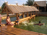Aztán amikor 28-án felvirradt a reggel még egy utolsó csoportegyeztetésen túlesve belevágtunk munkánkba. Legfőbb cél volt az elhanyagolt fürdő felújítása, környezetének rendbe hozása. Rögtön az elején ki kell emelnem, hogy a helyi fiatalok, fiúk és leányok, kisebbek és nagyobbak egyaránt „gőzerővel” serénykedtek az alapozó munkáknál is. Feladatunk sokrétű volt, kiterjedt területen dolgoztunk. 11 nap alatt elkészült egy 17×8 m-es, meglévő betonfalazatú, fa padozatú- és oldalfal burkolatú borvizes medencefürdő.