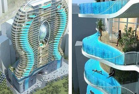 A még kivitelezés alatt álló apartmanháznak nem csak az a különlegessége, hogy 200 apartmant, háromszintes parkolóházat, szaunát és konditermet foglal magában, hanem legfőképpen az, hogy számos erkély helyén medence kapcsolódik a szobákhoz. A látvány elképesztő?