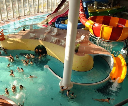 Az új létesítmény legattraktívabb elemei a lifttel megközelíthetõ, 30 méter magas toronyból induló 223 és 272 méter hosszú, zárt óriáscsúszdák. A belsõ élménymedence-térben a galériaszintrõl további 7 csúszda indul. Az aktív kikapcsolódásra vágyó vendégeket sodrófolyosók, pezsgõágyak és zuhatagok várják. A csecsemõket, illetve az 1-6 éves korosztályt 0-40 cm-es vízmélységû családi medenceterület fogadja a fürdõben. A nyári szezontól négyszintes, labirintusszerû játszóház biztosítja a gyermekek önfeledt szórakozását, míg a baba-mama világban az édesanyák nyugodt körülmények között tudják kisgyermeküket szoptatni, tisztába tenni.