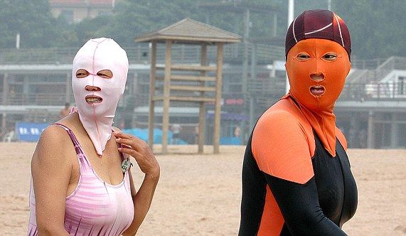 Hatalmas népszerűségnek örvend a kínai strandokon az arcot teljesen fedő napvédő maszk, amely már külföldi divatmagazinokból is visszaköszön.