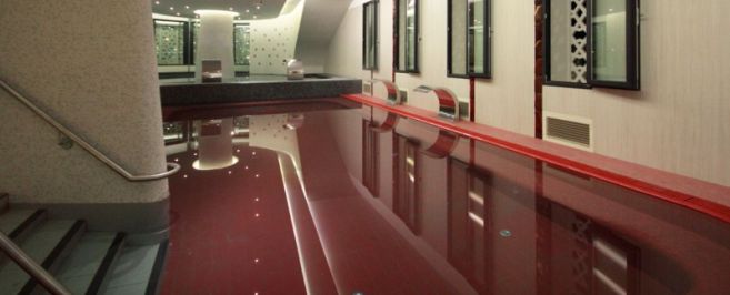 A beruházás során kialakításra kerülő földszinti medencetérben két közepes méretű és két kisebb (merülő) medencét alakítottak ki. Ez a terület a meglévő uszodából közvetlen átjárási lehetőséggel közelíthető meg. Az emeleten egy, az utcáról is megközelíthető, 232 m2 területű étterem várja a vendégeket. A tetőteraszon napozóterasz és jakuzzi üzemel. A pinceszinten helyezték el a gépészeti teret, az étterem konyhaüzemi helyiségeit és a vendégeket kiszolgáló mosdókat.