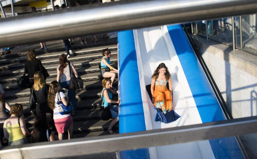A strandolást népszerűsítő csúszdát állított fel az Őrs vezér téri aluljáróban a Budapest Gyógyfürdői és Hévizei Zrt. Az egész napon át tartó kampány szlogenje: Vigyázat! Ismét csúsz(d)ásveszély!