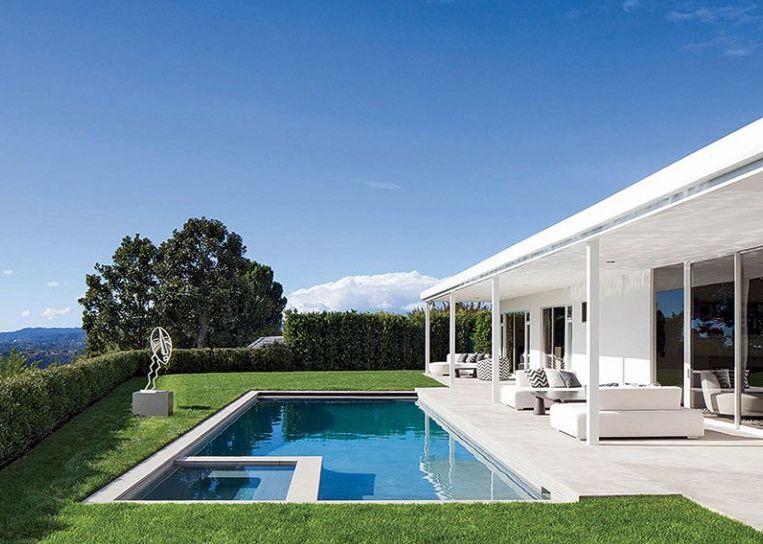 Gisele Bündchen és Tom Brady Los Angeles-i otthonában a feszített víztükrű medencéből a városra nyílik kilátás, a messzi háttérben a Csendes-óceánnal.