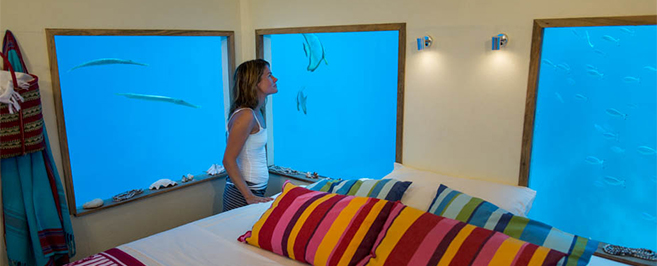 A fából készült úszólétesítményt svéd mérnökök tervezték és három szintből áll. A fürdőszoba és a nappali a tengerszint felett, míg a hálószoba a víz alatt található. Emellett egy nagy terasszal is rendelkezik, ahol kényelmesen lehet napozni. A színpompás halakra néző óriási hálószobai ablakok ámulatba ejtő látványt nyújtanak a vendégek számára.