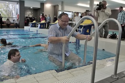 Az elegáns uszodát Újpest büszkeségei jelenlétében adták át: Kozák Danuta, Berki Krisztián, Dombi Rudolf, Tibolya Péter, valamint a város általános iskoláit képviselő gyerekek. A nagyszabású megnyitón a polgármester elsőként landolt az úszómedencében Erdei Zsolt ökölvívó világbajnok, Martinek János öttusázó olimpiai- és világbajnok, valamint Güttler Károly Európa bajnok úszó segítségével.