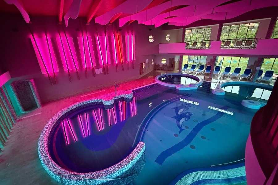 · Hatalmas wellness részleg: 5 beltéri és 2 kültéri medence, élményelemek, gyermekmedencék, exkluzív szaunapark (finn, bio, gőz és infraszauna, gőzkabin, jégbarlang), kényelmes pihenőterek