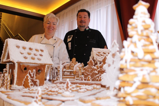 A debreceni szállodában Advent első napjára egy óriás mézeskalácsfalut épített fel a szakmai stáb - Mile József világbajnok mesterszakács és Fazekas Anna a hotel mestercukrásza - a szállóvendégek legnagyobb örömére.