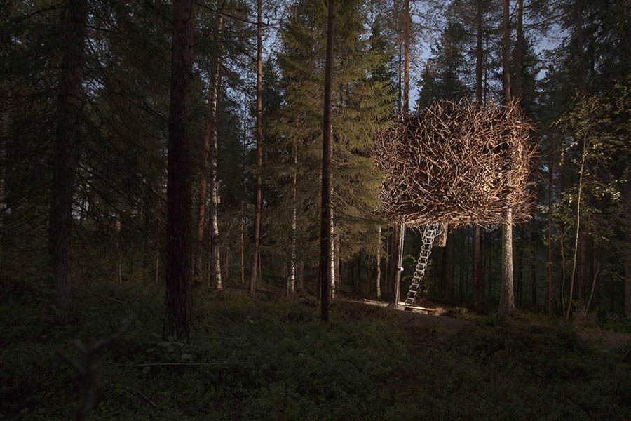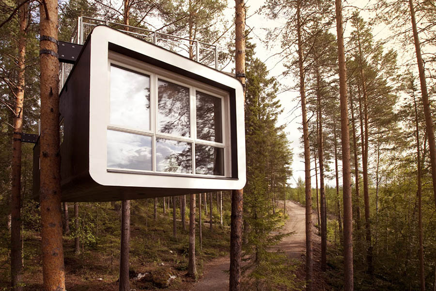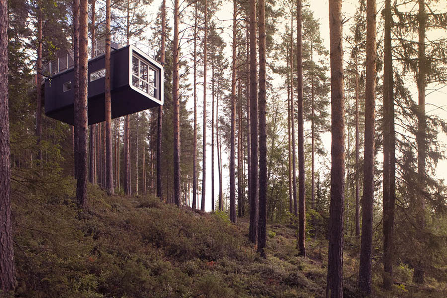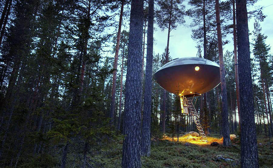 A hihetetlenül kreatív építészeti megoldásokat Svédországban találhatjuk. A fahotelek a föld felett,a fákon kaptak helyet, háborítatlan erdei környezetben. Minden szoba dizájnja teljesen egyedi, ha úgy tartja kedve, egy fonott madárfészekben, egy ufóban, vagy éppen egy tükörkockában bújhat el az ember a világ elől.