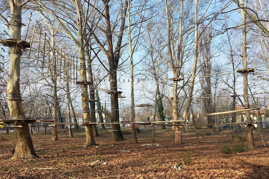 A Kalandpark fő attrakciója a háromszintes magaslati kötélpálya rendszer: