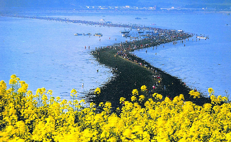 Dél-Koreában egy különleges árapály-jelenség következtében évente kétszer megnyílik a tenger, és egy rövid időre szabad átjárást enged Jingo és Modo szigetei között. Ez a Jindo csodája, amikor több ezren kelnek át a gyalog tengeren.