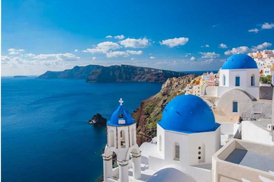 Varázslatos naplementék, festői templomok, fehérre meszelt házak találhatók a festői görög szigeten, Santorinin. A templomok kupolái, a házak kerítései mind-mind kék színűek, ami az Égei-tenger és a tiszta égbolt gyönyörű kékségével harmóniában egészen páratlan látvány.