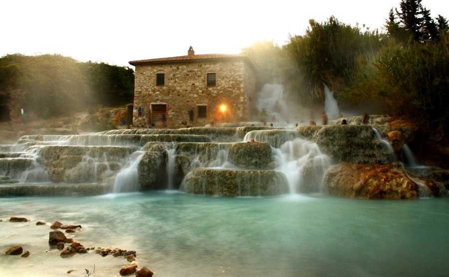 A legenda szerint a Saturnia geotermikus forrásait Jupiter hozta létre, amikor világító csavarokat dobott a földre. A festői toszkán vidéken fekvő Terme di Saturnia forrásnál feltörő 37,5 fokos víz természetes úton létrejött zubogó ‘kőkádakban’ folyik, majd folyóként tűnik el a nádasban. Másodpercenként 800 liter víz tör fel, de a forrást elhagyva a víz lelassulva folyik lefelé, érdemes keresni egy helyet, ahol masszírozó hatását megtapasztalhatjuk. A vízben lévő ásványi anyagok és gázok kedvezően hatnak a keringési és légzőszervi rendszerre.