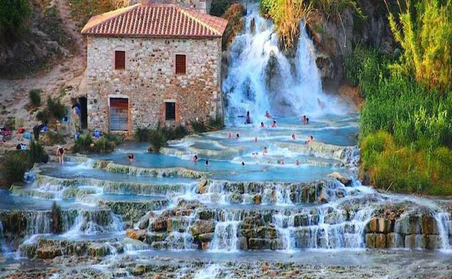 Saturnia csodás, gőzölgő vízesése állandó szereplője az olasz képeslapoknak. Igazi csoda, a természet különleges kincse, amelyet bárki kipróbálhat, aki Toszkánában jár. A festői vidéken zubogó Terme di Saturnia forrásnál feltörő 37,5 fokos víz természetes úton létrejött zubogó ‘kőkádakban’ folyik, majd folyóként tűnik el a nádasban. Másodpercenként 800 liter víz tör fel, de a forrást elhagyva a víz lelassulva folyik lefelé, érdemes keresni egy helyet, ahol masszírozó hatását megtapasztalhatjuk. A vízben lévő ásványi anyagok és gázok kedvezően hatnak a keringési és légzőszervi rendszerre. Turisták ezrei keresik fel naponta a Saturnia forrás csodáját, hogy mesterséges kádakban üldögélve, a termálvízzel masszíroztatva magukat gyönyörködjenek a toszkán naplementében.