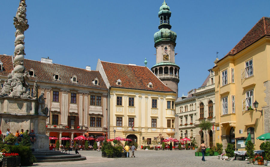 A Fő tér különleges hangulatát színeinek és fényeinek játékossága adja, mely egy tavaszi napsugaras reggelen vagy egy aranysárga őszi délutánon a legszebb. Először útikönyv nélkül - csupán a hangulatnak engedve - érdemes bejárni a történelmi városrész utcáit, benyomásokat szerezni egy-egy kapualjba bekukkantva. A legkülönbözőbb korokat és stílusokat képviselő emlékek a várost járó idegent azonnal rabul ejtik. A gótikus, barokk és reneszánsz építészeti megoldások mellett itt egyszerre jelen van a borpincékkel kialakított falusias városrészek hangulata. A városháza az 1896-os millenniumra épült, a vele szemben álló középkori Stornó ház a város talán leghíresebb épülete. Falai között egykor Mátyás király is megszállt. A Kecske templom a XVII. században koronázások és országgyűlések színhelyéül szolgált. A Fő téren álló Szentháromság-szobor pedig már-már Sopron védjegyének tekinthető.