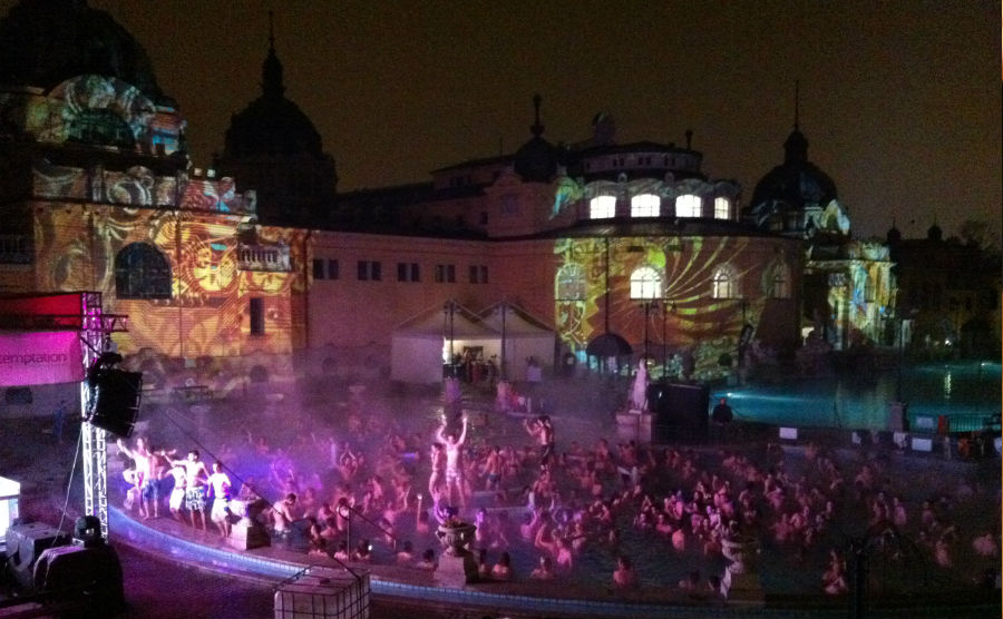 Aki régi strandok hangvilágában fürdőzne, a Széchenyiben a legendás énekesnő, Kovács Kati a Qualitons zenekarral, Parti Nagy Lajos, Kossuth-díjas szerző pedig multimédiás kísérettel lép dobogóra. A Rudasban az elvarázsolt Magic Bath programja a török fürdőben orientális programokkal, hastánccal, az előtérben Super8-as filmvetítéssel, és jazz, beat, funk zenékkel kecsegtet. A Gellért vizidiszkóvá alakul: a néhai Fortuna slágerei csendülnek fel újra a falak között: Sterbinszky, Feaky D, Felhő gyűjteményből. Az aprócska Király fürdő különlegessége ezen az estén, hogy éjszaka is igénybevehető, szombaton is mindkét nem számára. A négy fürdő között ingyenes buszjárat szállítja a fürdőzőket.