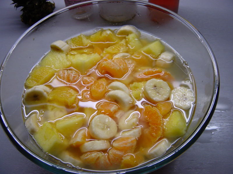 A mazsolát átmossuk, majd vízbe tesszük, amibe előzőleg rumaromát kevertünk. Ebben áztatjuk 20 percig. Egy 5 literes edénybe vagy tálba beleöntjük a Traubisodát és a befőtt levét. A gyümölcsöket meghámozzuk, felvágjuk szeletekre, szétszedjük gerezdekre, a befőtt tartalmát is a finomsághoz adjuk. Legutoljára a mazsola marad, ezt is hozzákeverjük. Ha kész, betesszük a hűtőbe, lefedve, fél vagy egy napig érleljük.